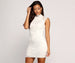 This pretty little dress perfect for a semi formal event is composed of sheer lace. includes a full lining. and features a mock neck. cap sleeves and a mini length. Closes with a back zipper closure.