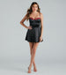 The prettiest satin skater dress for school dances or birthdays! It features a sleeveless sweetheart neckline with rose applique trim. adjustable spaghetti straps. a built-in padded and underwire bust. and a short-length hem. Complete the look with a clutch and heels.