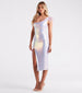 Bring the drama to the evening in the Priah formal sequin dress at banquets or black tie parties! She features a sleeveless one-shoulder neckline with a feathered tank strap. a bodycon silhouette. and a flirty front slit along her midi-length hem. The formal dress is composed of a striking iridescent sequin-knit mesh fabric for the perfect sparkle and a stretchy knit lining. Complete your flawless look with silver rhinestone earrings and bracelet.