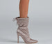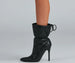 What a rare find these quilted stiletto booties are! They feature a pointed toe. stiletto heel. a scrunched ankle. and an adjustable drawcord. Composed of quilted satin material. Style with a trench coat for a chic look.