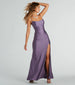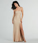 Slip into the simple yet chic Quincy formal dress! She features a sleeveless cowl neckline. adjustable spaghetti straps for a customizable fit. an open back with a lace-up tie design. and a fitted. floor-length. A-line silhouette with a high side slit. Style this dress with rhinestone heels to add a hint of sparkle.