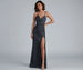 Bring the sparkle and shine with a formal dress that illuminates on your special night. The dress features a sleeveless V-neckline with padded cups. adjustable spaghetti straps. ruching. a high side slit. and an A-line silhouette. The dress is composed of a lined woven glitter fabric that offers a form hugging fit with a moderate stretch. Complete look with rhinestone heels.Â