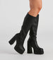 Totally rad and retro. you'll be one edgy chick in these fab under-the-knee boots featuring an almond toe. chunky platform sole and block heel. and side zipper closure. and are composed of faux leather material. Complete the look in a printed mini-dress for a party!