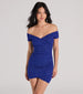 Radiant shine in this glitter party dress - perfect for a girl's night or bachelorette weekend! It features a chic off-the-shoulder neckline. short-sleeve cuffs. a bodycon silhouette. and a side ruched seam that leads the asymmetrical mini-length hem. Complete the look in strappy block heels.