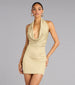 Turn every entrance into a spotlight moment with this halter mini dress. Designed in a metallic slinky fabric that hugs in all the right places. it features a plunging cowl neckline and a strappy open back that brings full-on glam energy.