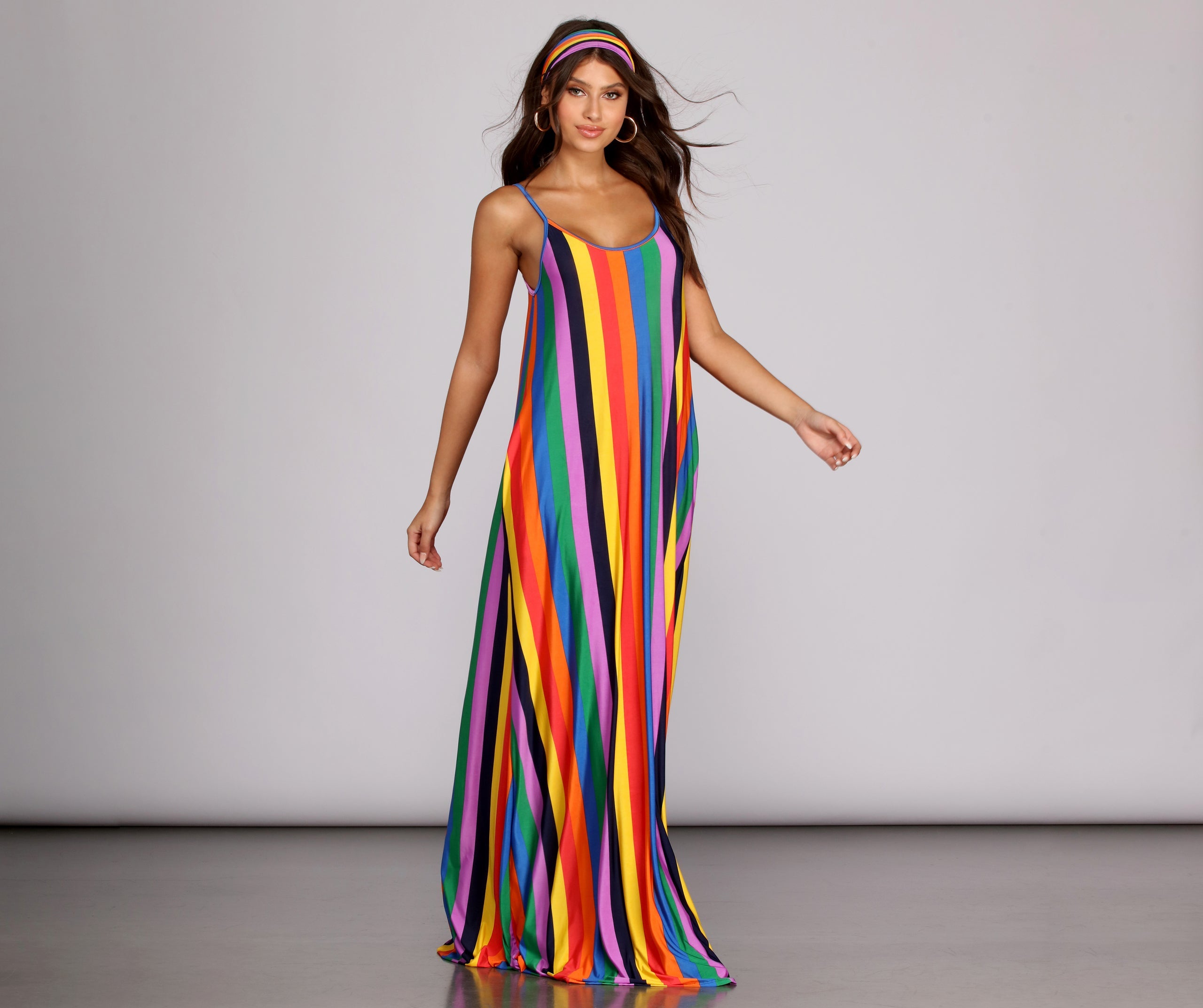 You love color. so embrace the rainbow! All eyes will be on you in this vibrantly chic maxi dress. which features a multi-hued stripe pattern. spaghetti straps. scoop neck. pockets at either hip. and plenty of stretch. Don't forget to pair it with the matching head wrap!Â