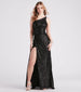 Radiate gorgeous glamour at Homecoming in the Rayne sequin formal dress! She features an asymmetric one-shoulder neckline with dual spaghetti straps. an open back with an asymmetric strap accent. ruching at the waist. a floor-length hem. a faux wrap-front design creating a high slit. and a slim-fit silhouette. The all-over sequin embroidery will shimmer and shine all night long. Complete your look for a black-tie event with strappy stilettos.