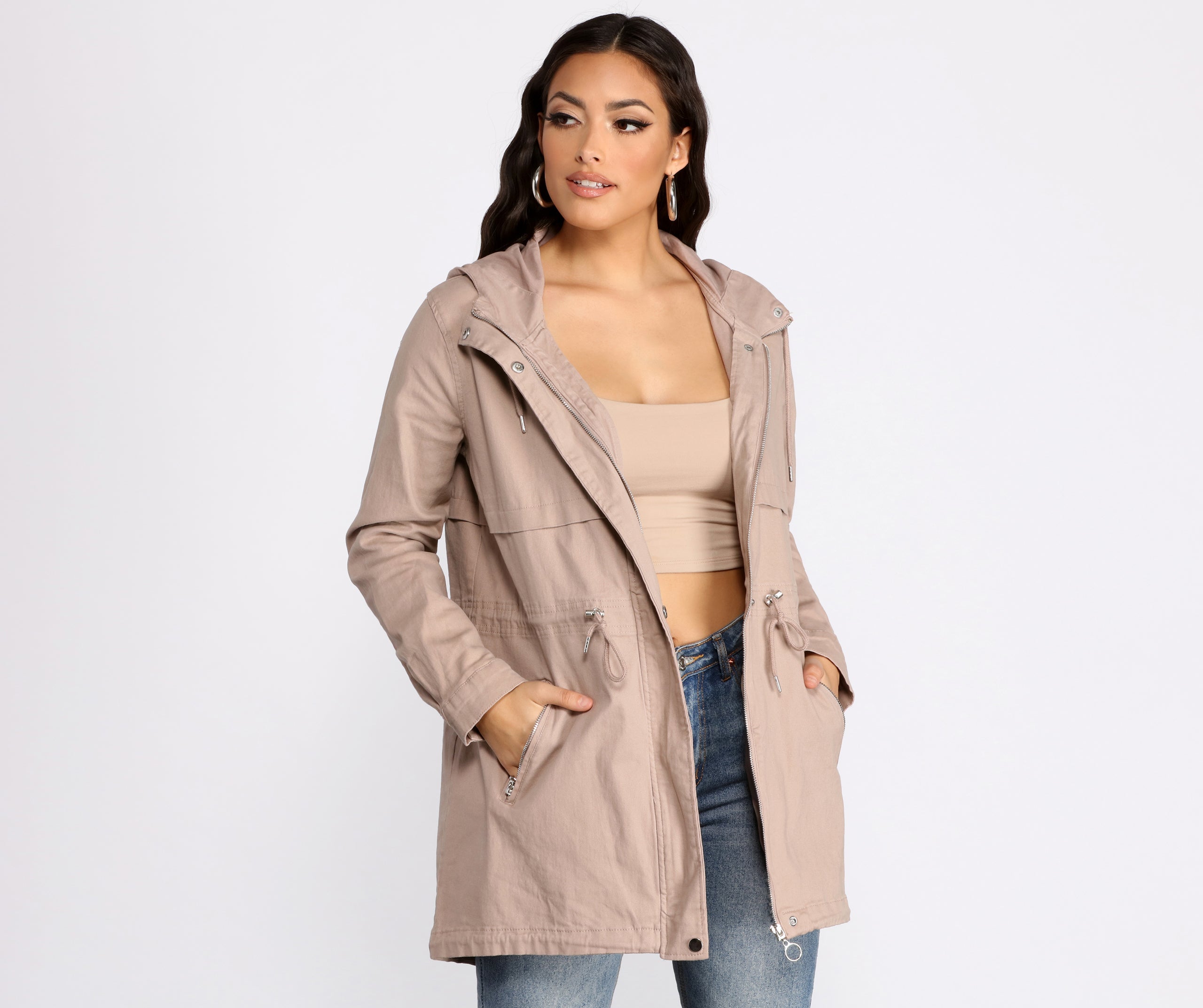 You'll be totally ready for the day by layering on this stylish zip front anorak! Its O-ring zipper detailing gives the classic jacket a trendy feel.