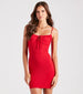 Ready for some sun? Let this rib knit mini dress cue the sunshine! It features a sleeveless scoop neckline. a flirty bust tie with a keyhole accent. spaghetti straps. and a bodycon silhouette. Complete the look in trendy flat sandals for a backyard bbq!