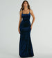 A grand and beautiful look is easy to achieve in the Reagan glitter velvet formal dress perfect for black tie soirees or weddings! Crafted from luxurious glitter velvet fabric. this formal dress epitomizes chic. She boasts a flattering square neckline and bungee spaghetti straps accentuate your figure. while the strappy open back adds a touch of sensuality. The mermaid silhouette and floor-length hem create a stunning silhouette. Complete the look with fringe earrings.