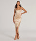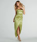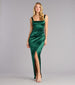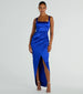 Effortlessly alluring. the Rebecca satin slim-fit formal dress is a must-have for weddings. parties. or any special affair. She features a sleeveless square neck and back design. tank shoulder straps. a corset-inspired bodice with a fitted high waist seam. a floor-length hem with a faux wrap-front creating a slit. ruched detailing. and a slim-fit silhouette. The silky satin-knit fabric offers a moderate stretch. Complete your look with this chic formal dress with platform heels.