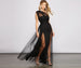 Get a gorgeous look for your next fancy soiree in our stunning Rebecca formal dress! She features a strapless sweetheart neckline with a one-shoulder sheer tulle overlay. a side zipper and hook and eye closure. and a high waist. Her flowy floor-length skirt has an A-line silhouette with dual front slits. The dress is composed of a sheer tulle fabric with a knit lining. offering moderate stretch. Complete your look with block heels and a chic evening bag.