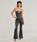 A rebel chic faux leather wide-leg jumpsuit pant with a plunging wired V-neckline and padded bra cups. Sleeveless with a straight-leg fit. it's your go-to for fearless style.