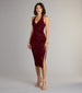 The midi dress features a sleeveless halter neckline with a single halter neck strap. a floral flocked velvet pattern. and a high side slit. Complete the cocktail outfit with sleek stiletto heels.