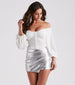 Reign in this glitter velvet top for upcoming holiday soirees! It features an off-the-shoulder. sweetheart neckline. peasant sleeves. a padded bust. a hidden front hook and eye closures. and a cropped hem. Pair with sleek shorts to complete the look!