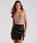 Reign the night with a sparkling bustier that puts you in the spotlight! The bustier features a sleeveless sweetheart neckline. padded push-up cups. removable and adjustable spaghetti straps. a dazzling sequin and rhinestone embellished bodice. a sheer mesh insert under the bust with contrast flexible boning. a cropped hem. and back hook and eye closures. Complete your party look with a high waist mini skirt.