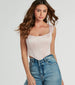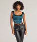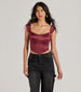 Transform into a captivating beauty in this satin corset top perfect for dressing up for parties or dates! The sleeveless square neckline and wide shoulder straps accentuate your figure. while the flexible boning provides support. The cropped hem and lace-up back add a touch of allure. all crafted from luxurious satin fabric. Complete the look in a sultry mini skirt.
