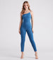 This curve-hugging denim catsuit will make you a fab retro diva! It features an asymmetric one-shoulder neckline. a single adjustable spaghetti strap. a partially open back. a fitted high waist seam. and form-fitting pant legs. Style with sleek hoops and clear heels.