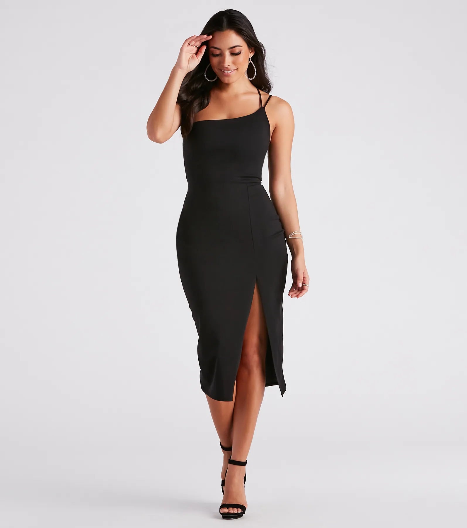 Showcase your sophisticated demeanor in the Rhea formal dress to bring effortless beauty to dinner parties. mixers. and date nights! She features a sleeveless one-shoulder neckline. dual asymmetrical spaghetti straps. a form-hugging silhouette. and a flirty slit along her midi-length hem. The formal dress is composed of a crepe knit fabric with a moderate stretch. Style with sparkly hoop earrings and heels to complete the look!