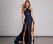 Take the plunge in our daring Rhonda dress! She features a halter neck with neck ties. a matching open back and a narrow waistband accent. Her slim fit bodice leads to a sweeping floor length silhouette that is accented with double high slits to showcase your heel game! She is composed of smooth knit fabric that offers a curve hugging fit with a moderate stretch. Includes additional shorts lining.