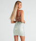 Short. sweet. and oh-so-chic the Ria formal dress is party-perfection! She features a sleeveless. cowl neckline with adjustable spaghetti straps. an open back with lace-up closure for a customizable fit. and a short. curve-hugging silhouette. The party dress is composed of a delicate sequin scroll embroidery on mesh fabric with a knit lining and minimal stretch. Complete your homecoming look in sparkly earrings for a night to remember.