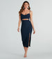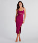 The Robyn formal glitter midi dress is perfect for making a chic statement and sophisticated style! Beautifully appointed with a cowl neckline. spaghetti straps. and a cutout bodice. this bodycon midi dress is an elegant choice for any special occasion. The glitter-lined fabric provides a touch of luxe. and the front slit details add a flirty allure along her midi-length hem. Complete the look with earrings for a banquet or cocktail party.