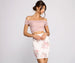 Bring those romantic vibes in this pretty floral and lace mini dress. It features a lined lace top with an off-the-shoulder neckline. sheer short sleeves. a front waist cutout with a scalloped lace trim. and a short scuba knit skirt with an all-over blooming floral print. Pair this dress with dainty earrings. a chic ring set. and clear heels for a pretty look.