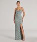 Showcase chic elegance in the Romina formal mermaid dress crafted with sheer detailed lace fabric with a complete knit lining. It features a sleeveless sweetheart neckline with a built-in padded bust. a draped cowl neck overlay. adjustable spaghetti straps for a customized fit. and a floor-length mermaid silhouette accented with a high-cut front slit.