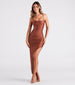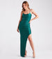 Put your best silhouette forward in the Rosa formal dress made to flaunt what you got! Perfect for banquets or dressy cocktail parties. She features a sleeveless square neckline. spaghetti straps that crisscross in the back. a bodycon silhouette. and a side ruched seam atop a sexy high slit and long hem. The formal dress is composed of a slinky knit fabric with a sheen effect and moderate stretch. Complete the look with a layered necklace.