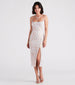 The main event will be you in the Roxanne formal dress to serve up sparkle at engagement parties. birthdays. and major events! She features a sleeveless square neck. adjustable spaghetti straps. a lace-up back design. a bodycon silhouette. and a sultry slit along the midi-length hem. The formal dress is composed of a sequin-pattern mesh fabric with a knit lining and minimal stretch. Style with a metallic clutch.