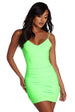 Take on the night in this sexy mini dress! It features a neon green hue. a sleeveless bodice. a V neckline. narrow shoulder straps and a partially open back with ruched detailing. Dress is composed of a curve hugging mesh fabric with plenty of stretch.