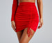 Get ready for a night out in this ruched mini skirt featured in a high-rise waist. drawstring with self-tie. composed of a slinky-knit fabric with a moderate stretch. Complete the look with the matching top.