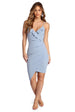 It's no party without a little bit of ruffle fun! This blue dress features a wrap bodice with a V neckline paired with a ruffle trim. spaghetti straps leading to a square back. ruching on one side. and a wrap skirt with a subtle asymmetrical hem. Dress is composed of an unlined crepe fabric that offers a moderate stretch.