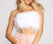 Ruffle some feathers in this too cute tube top! This trendy crop will make a stylish statement. It features a strapless square neckline with a majorly cropped hem and a knit fabric with allover feather detailing. Pair this top with faux leather pants for a night out with the girls.