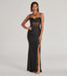 Pure brilliance and elegance are perfect to achieve in the Sadie mermaid formal dress as you make your way into Hoco or a fancy event! Crafted from a sleek knit fabric. this dress is a stunning option. She features a flattering cowl neckline adorned with adjustable spaghetti straps and padded bra cups for support. Show off your figure in her sheer mesh corset bodice with flexible boning and rhinestones that lead to the open back design that turns heads. The formal dress is finished with a mermaid silhouette and a high front slit along the dramatic floor-length hem. Complete the look with earrings and heels.