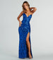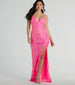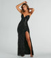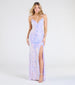 A sparkling sequin scroll pattern adds beauty and shine to the glamorous Saige formal long dress! With a lace-up back that turns heads. a curve-hugging mermaid silhouette. and a high slit for a gorgeous look.