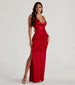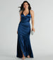 Slip into this silky satin number! Sam is here for you and your next dressy affair. She features a sleeveless. plunging V-neckline. a built-in padded bust. and wide shoulder straps that lead to her open-back design with lace-up straps. a zipper closure. and bum ruching. Her form-fitting. A-line silhouette hugs your curves while the side slit accent lets you showcase some leg on the floor-length hem. The formal dress is composed of a luxe satin-stretch fabric with lining. Complete the look with an elegant hair comb to tame your tresses in style.