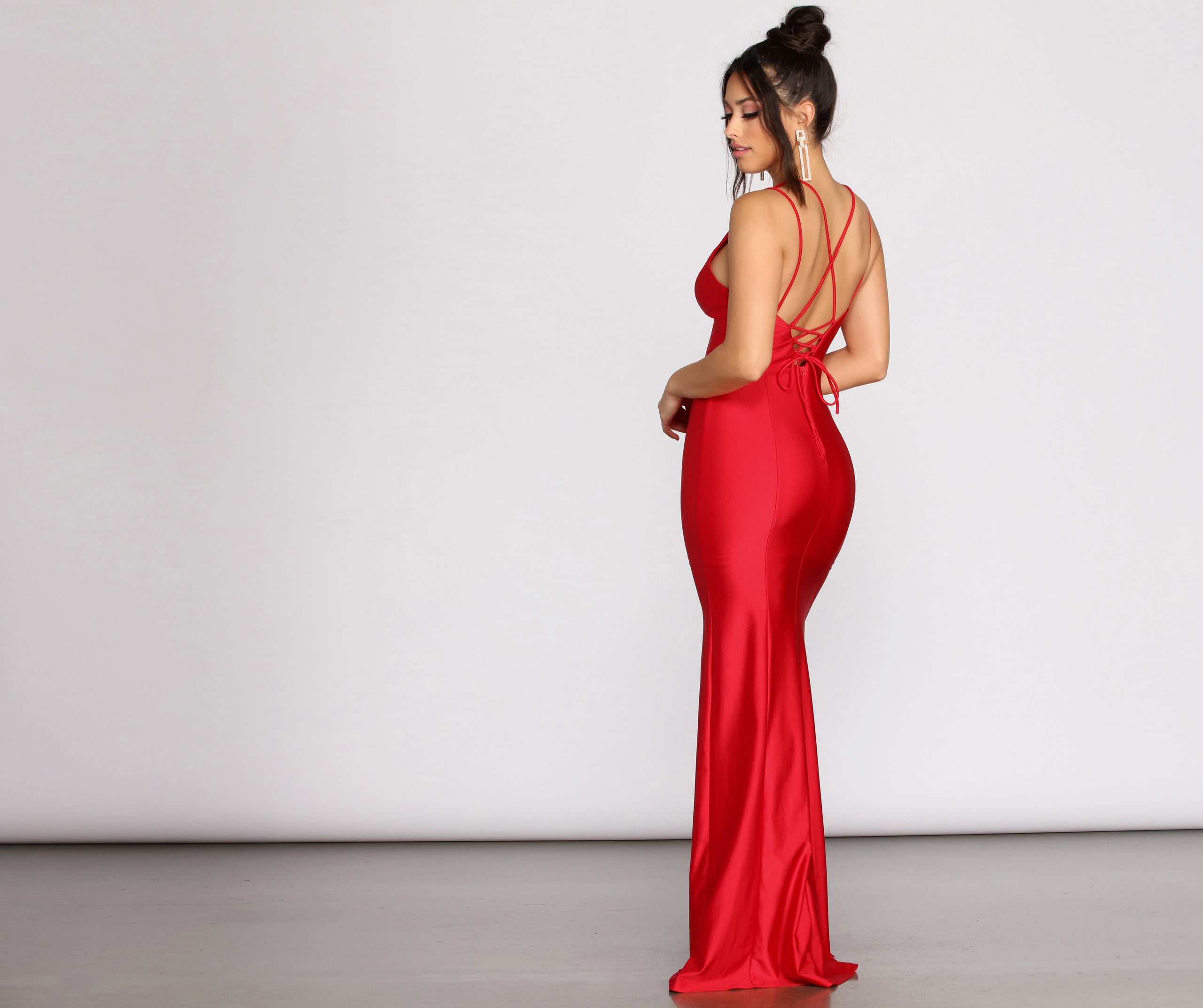 Lace up and head out for an elegant evening in our captivating Sami dress! Her high slit and mermaid silhouette showcase curves in all the right places!
