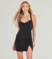 Strut into the party with a sassy flair in this strappy back mini dress! Designed with a sleek and stretchy knit. it offers a bodycon silhouette to flaunt your gorgeous curves. The dress features a sleeveless cowl neckline. thin tank shoulder straps that lead to an open back with a cross-back strap design and tie closure. and a chic side slit on the mini-length hem.