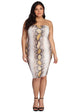Stay sassy as you slay in trendy snake print! This dress features a sweetheart neckline. padded cups. an elastic back for a comfortable fit and a midi length silhouette. Dress is composed of a partially lined faux leather fabric that offers a relaxed fit with a slight stretch. The all over snake print features tan. taupe and brown hues.Â