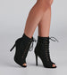 Have a sassy moment in these sultry and stylish stiletto booties. They feature an almond-shaped peep toe. a front lace-up design. an inner zipper closure. and a sleek stiletto heel. Wear these booties with a faux leather mini skirt for your next night out.