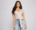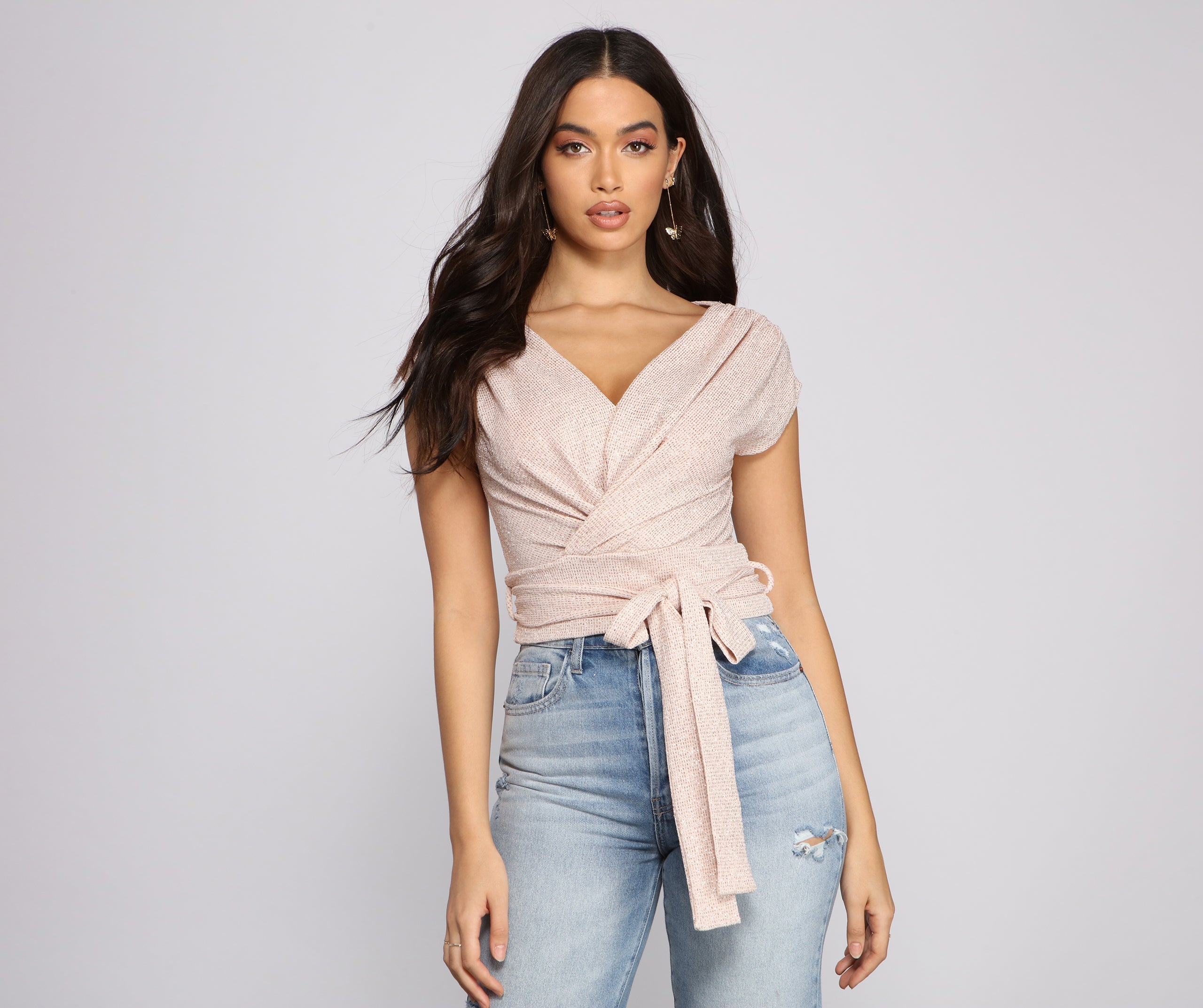 This shimmering top is what you need to illuminate your date night. The top features a cowl neckline. cap sleeves. a tie waist hem. and composed of a lurex glitter knit fabric. Complete your look with a faux leather mini skirt.