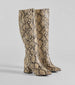 This pair of faux leather boots features a sassy snake pattern. a pointed toe. inner zipper closure. a block heel. and an under-the-knee length fit perfect for styling with skirts or dresses.