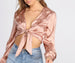 Satin is the fabric of the season. and the romantic floral print adds a pretty touch to this tie front top.