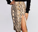 Keep it sultry in satin with this snake print midi skirt. It feaures a high rise waist. a hidden back zipper closure. a thigh high front slit. and a mid-length. flowy fit. The satin-like fabric is unlined and has no stretch.