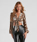 Scale back your GNO fit and keep it sultry and sleek in this snake print crop top featuring peasant sleeves. a plunge v-neckline. and a tie-front closure. Style with faux leather leggings and mules.