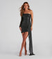 A delicate side drape and glitter steals the show on the Scarlet formal dress perfect for all-night dancing! She captures all the attention in her sleek. one-shoulder design with a sheer long sleeve. high waist seam. and bodycon short skirt. Her side cascading drape creates a dramatic flair for the evening while elongating your figure! The formal dress is composed of a sheer glitter knit overlay with a knit lining and moderate stretch. Complete the look in statement earrings and sassy heels.