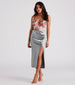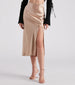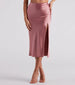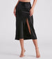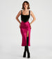 Step into the spotlight and keep all eyes on you in this alluring satin midi skirt! It features a high-rise waist. a hip-hugging silhouette. a midi-length flared-out hem. and a sultry thigh-high front slit to showcase some leg. The silky satin fabric has minimal stretch. Style with a corset top and over-the-knee boots.