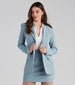 Stun in a blazer that will have you business ready to take on the day! The blazer features a collared neckline. lightly padded shoulders. a multi-button down front. a faux chest pocket. long sleeves. front pockets. and a mid-length hem. The blazer is composed of a lined woven fabric that offers a relaxed fit with minimal stretch. Complete look with the matching mini skirt and mules.