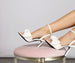 Seal your look with pretty heels that bring captivating deets! The heels feature an open back. an adjustable ankle strap. an open almond toe. a strap over the tow with a bow accent. and a sleek stiletto heel. Complete look with a satin midi dress.